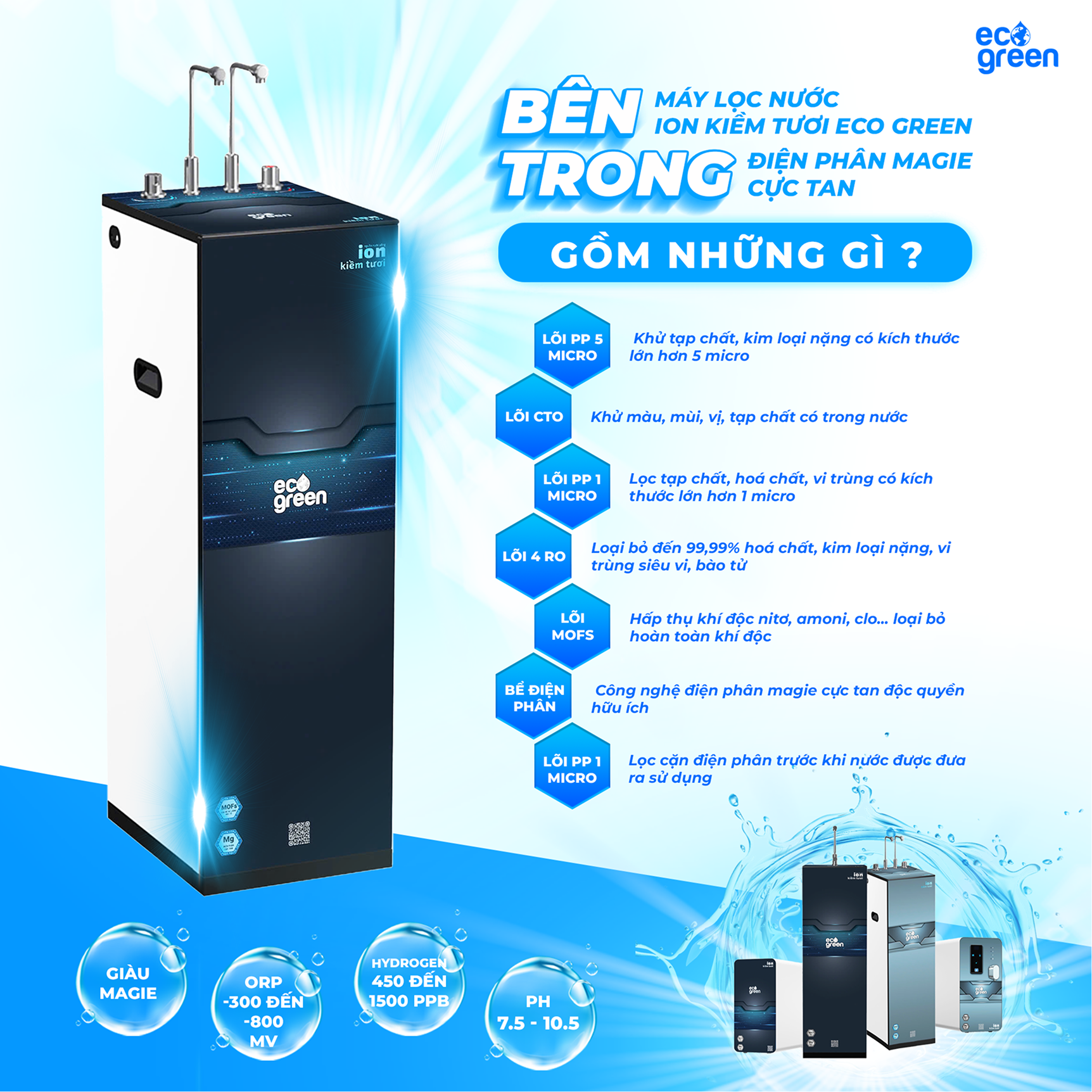 Với công nghệ điện phân cực tan Magie độc quyền, ECO GREEN không chỉ tạo ra nước ion kiềm giàu hydrogen và khoáng chất, mà còn tối ưu hóa an toàn, tiện ích và chi phí sử dụng. Đây chính là giải pháp nước uống thông minh, chăm sóc sức khỏe toàn diện, hoàn toàn phù hợp với nguồn nước Việt Nam, cho mọi gia đình Việt.