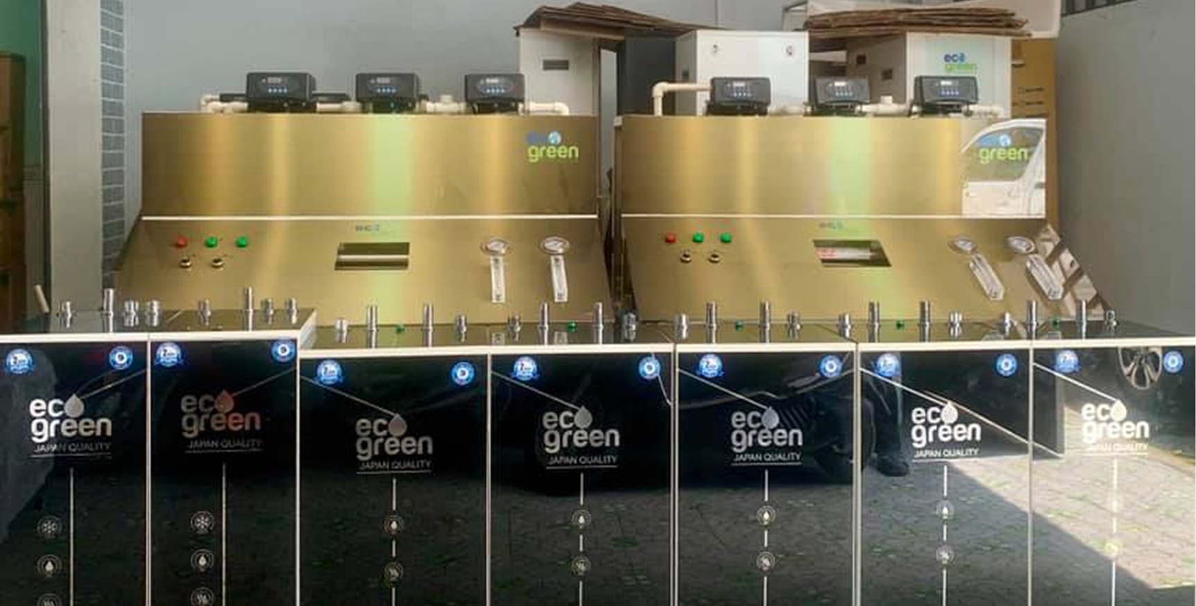 Nguồn nước đầu vào thường là nước máy, nước giếng sẽ đi qua hệ thống lọc thô lần lượt qua ba lõi PP, UDF, CTO. Không những thế, hệ thống máy lọc nước công nghiệp Eco Green còn có khả năng xử lý nguồn nước đầu vào vị nhiễm phèn, nhiễm mặn. Mỗi lõi sẽ thực hiện nhiệm vụ khác nhau, lõi PP như một tấm lưới với khe lọc 5 micromet, lọc bỏ các hạt cặn, rỉ sét, bùn đất có kích thước lớn hơn khe lọc. Tiếp theo, nước sẽ mất hết mùi hôi, màu sắc lạ và một phần chất độc hại, kim loại nặng và vi khuẩn khi đi qua lõi UDF. Sau đó, lõi CTO sẽ tiếp tục giữ lại những tạp chất, vi khuẩn có kích thước trong khoảng 1-5 micromet mà hai lõi lọc trước đó chưa làm được. Như vậy, nguồn nước đầu vào đã được xử lý sơ bộ và tiếp tục di chuyển đến hệ thống lọc RO.