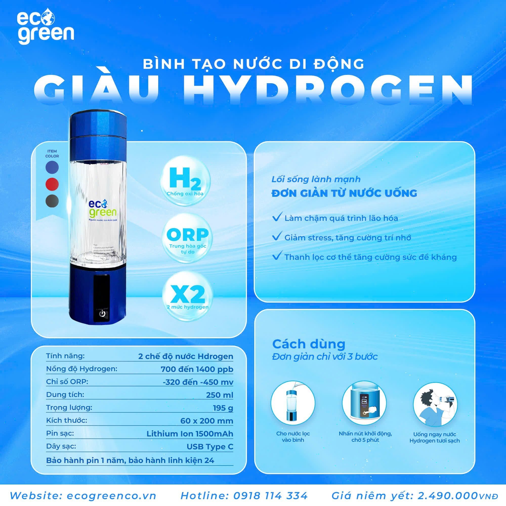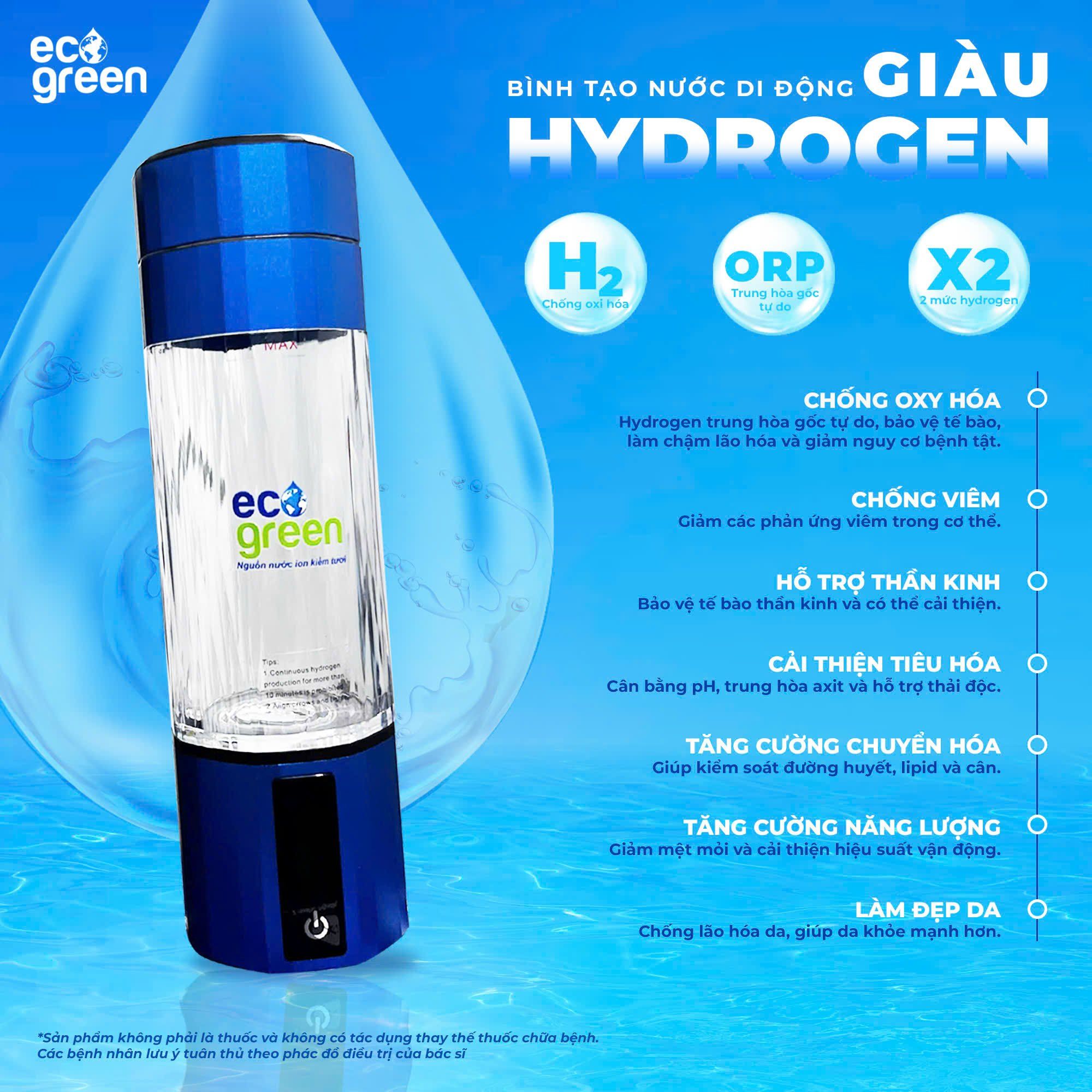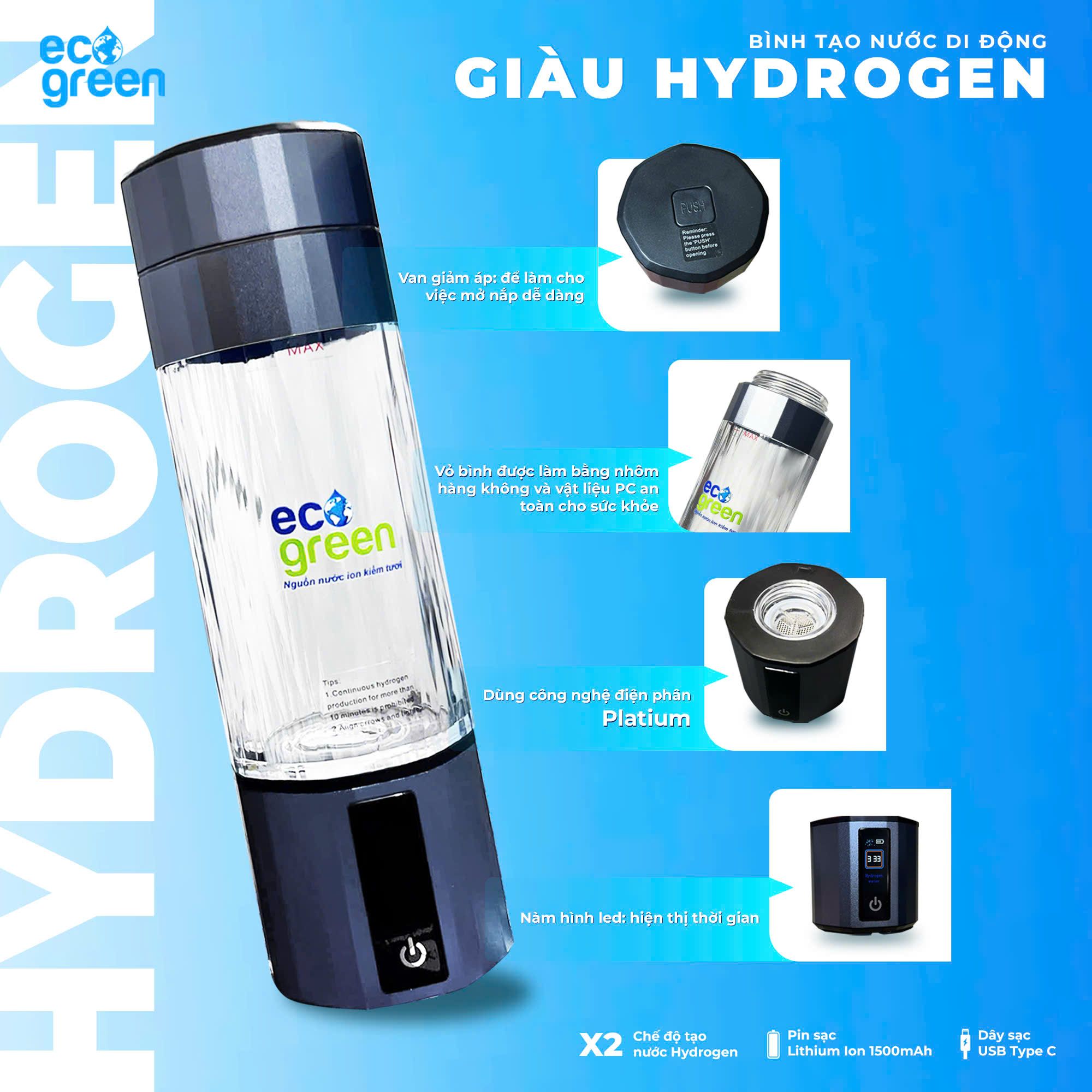 Bình Tạo Nước Di Động Hydrogen EcoGreen là lựa chọn hoàn hảo để bạn và gia đình chủ động sở hữu nguồn nước giàu hydrogen mọi lúc, mọi nơi – an toàn, chuẩn chất lượng, tiện lợi và chăm sóc sức khỏe toàn diện.